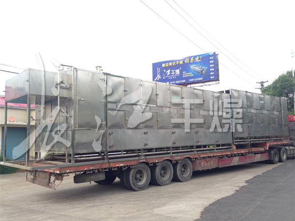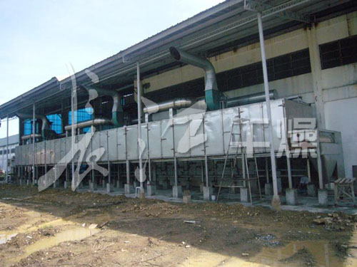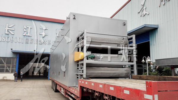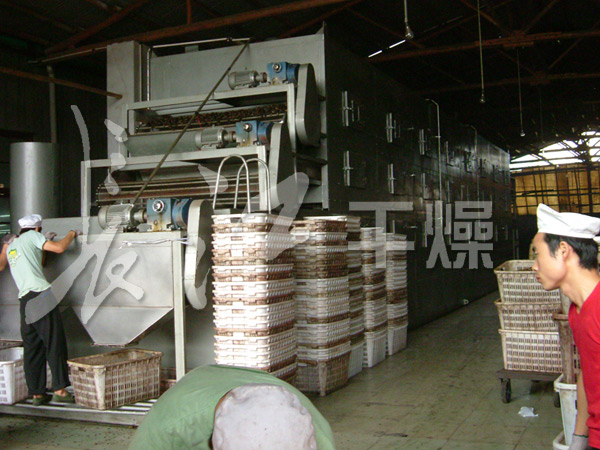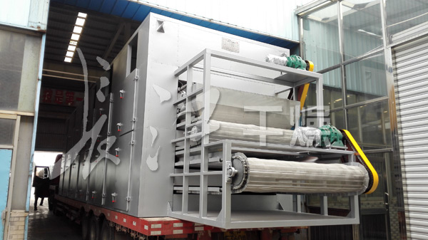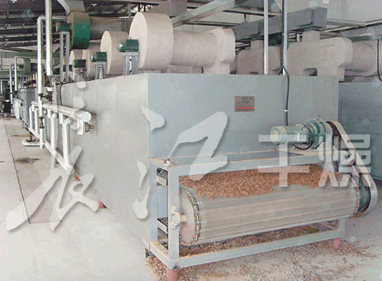 物料由加料器均勻地鋪在網帶上,網帶一般采用12-60目不銹鋼絲網,由傳動裝置拖動在干燥機內移動。干燥機由若干單元組成,每一單元熱風獨立循環,部分尾氣由專門排濕風機排出,廢氣由調節閥控制,熱氣由下往上或由上往下穿過鋪滿物料的網帶完成熱量與質量傳遞的進程,帶走物料水份。網帶緩慢移動,運行速度可根據物料溫度自由調節,干燥后的成品連續落入收料器中。上下循環單元根據用戶需要可靈活配備,單元數量亦可根據需要選取