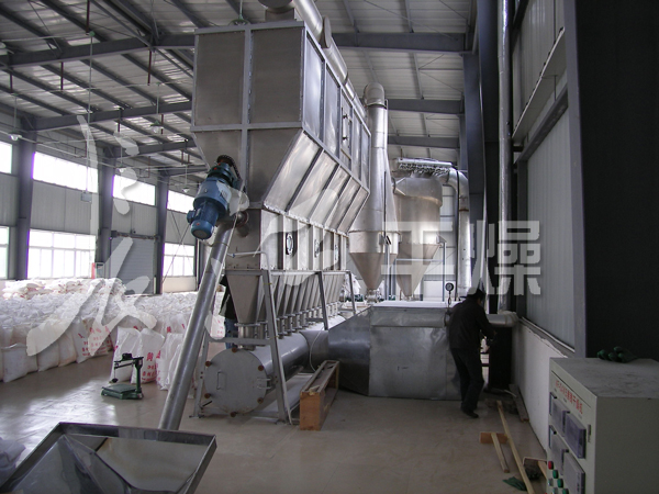 散粒狀固體物料由加料器加入流化床干燥器中,過濾后的潔凈空氣加熱后由鼓風機送入流化床底部經(jīng)分布板與固體物料接觸,形成流態(tài)化達到氣固的熱質(zhì)交換。物料干燥后由排料口排出,廢氣由沸騰床頂部排出經(jīng)旋風除塵器組和布袋除塵器回收固體粉料后排空。