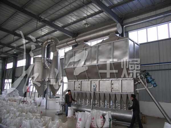 潔凈的熱風經(jīng)閥板分配進入床體內(nèi),從加料器進入的濕物料被熱風形成沸騰狀態(tài)。由于熱風與物料廣泛接觸,增強了傳熱傳質(zhì)的過程,因此在較短時間內(nèi)就可干燥。如用連續(xù)型,物料從床體的一頭進入,經(jīng)過幾十秒至幾分鐘沸騰干燥,自動從床體另一頭流出。本設(shè)備一般進行負壓操作。