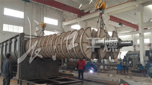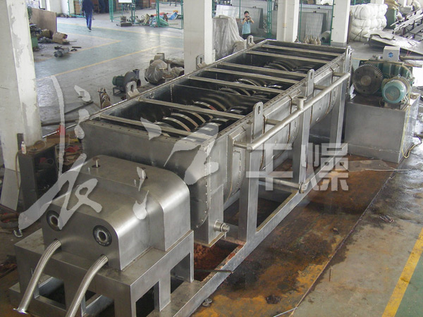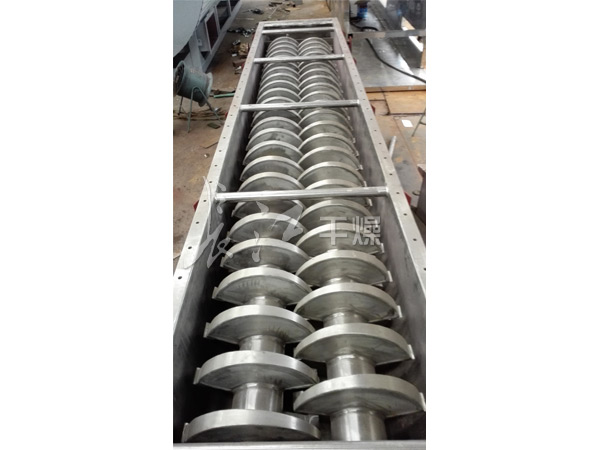 空心軸上密集排列著楔型中空漿葉,熱介質經空心軸流經漿葉。單位有效容積內傳熱面積很大,熱介質溫度從-40℃到320℃,可以是水蒸汽,也可以是液體型:如熱水、導熱油等。間接傳導加熱,沒有攜帶空氣帶走熱量,熱量均用來加熱物料。熱量損失僅為通過器體保溫層向環境的散熱。楔型漿葉傳熱面具有自清潔功能。物料顆粒與楔型面的相對運動產生洗刷作用,能夠洗刷掉楔型面上附著物料,使運轉中一直保持著清潔的傳熱面。漿葉干燥機的殼體為Ω型,殼體內一般安排二到四根空心攪拌軸。殼體有密封端蓋與上蓋,防止物料粉塵外泄而充分發揮作用。傳熱介質通過旋轉接頭,流經殼體夾套及空心攪拌軸,空心攪拌軸依據熱介質的類型而具有不同的內部結構,以保證理想的傳熱效果