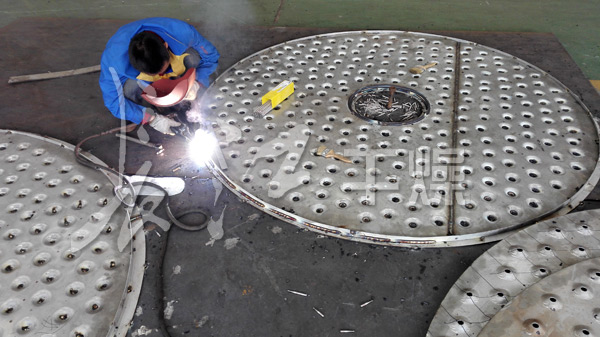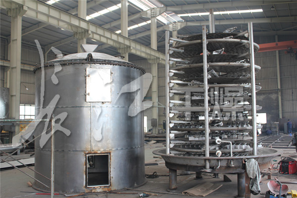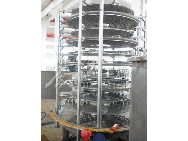 濕物料自加料器連續地加到干燥器上部第一層干燥盤上,帶有耙葉的耙臂作回轉運動使耙臂作回轉運動使耙葉連續地翻抄物料。物料沿指數螺旋線流過干燥盤表面,在小干燥盤上的物料被移送到外緣,并在外緣落到下方的大干燥盤外緣,在大干盤上物料向里移動并從中間落料口落如下一層小干燥盤中。大小干燥盤上下交替排列,物料得以連續地流過整個干燥器。中空的干燥盤內通入加熱介質,加熱介質形式有飽和蒸汽、熱水、導熱油和高溫熔鹽,加熱介質由干燥盤的一端進入,從另一端導出。已干物料從^后一層干燥盤落到殼體的底層,^后被耙葉移送到出料口排出。濕份從物料中溢出,由設在頂蓋上的排濕口排出,真空型盤式干燥器的濕氣由設在頂蓋上的真空泵口排出。從底層排出的干物料可直接包裝。通過配加翅片加熱器、溶劑回收冷凝器、袋式除塵器、干料返混機構、引風機等輔機,可提高其干燥的生產能力,干燥膏糊狀和熱敏性物料,可方便地回收溶劑,并能進行熱解和反應操作。