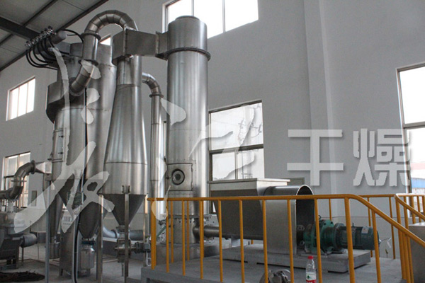 熱空氣由進風口 以適宜的噴動速度從干燥機底部進入攪拌粉碎干燥室,對物料強烈的剪切、吹浮、旋轉作用,于是物料受到離心、剪切、碰撞、磨擦而被微粒化,強化了傳質傳熱。 在干燥機底部,較大較濕顆粒團在攪拌器的作用下被機械破碎,濕含量較低、顆粒度較小的顆粒被旋轉氣流夾帶上升,在上升的過程中進一步干燥,由于氣固相作旋 轉流動,固相慣性大于氣相,固氣兩相間的相對速度較大,強化兩相間的傳熱效果,所以該機干燥強度高。
