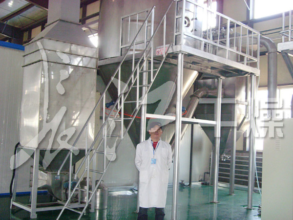 該生產線由供料系統、介質循環系統、空氣加熱凈化系統、干燥塔系統、收料系統、控制系統等多個系統整合而成。主塔系統集中了目前噴霧干燥工程的所有尖端技術,噴干機組的收料系統由一級旋風分離器+布袋除塵器組合形成。一級旋風采用高氣量高效率旋風進行收集,其收粉率能達到96%左右分,而布袋除塵器是針對蛋白粉類除塵專門設計的優化設備,能使物料與風進行完全分離并沉降,布袋為拒水防油防靜電布袋,過濾目數可達500目以上。